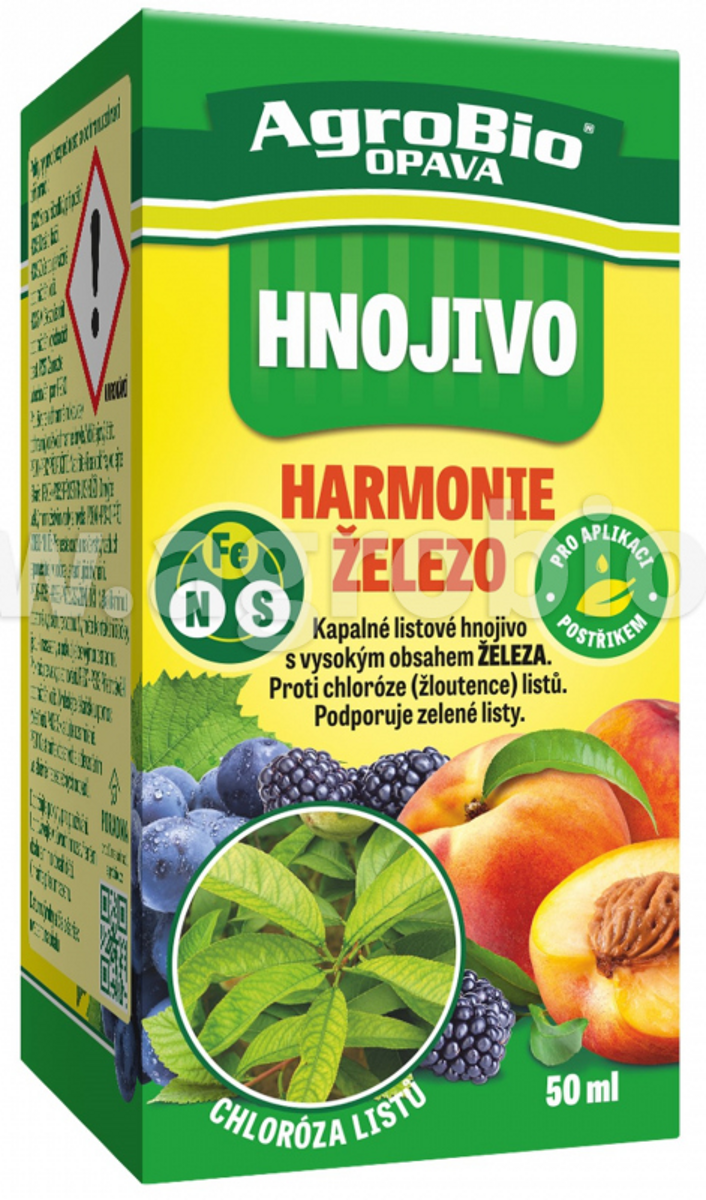 Kapalné hnojivo HARMONIE Železo je koncentrovaný postřik s vysokým množstvím železa. Hnojivo HARMONIE aktivně zabraňuje žloutnutí listů, chloróz broskvoní, vinné révy, citrusových plodů, okrasných plodů aj. Aplikace je velice snadná, a to po rozmíchání aplikujeme postřikem přímo na listy. Další velkou výhodou postřiku HARMONIE železo je že přispívá ke zvýšení množství chlorofylu, asimilačního povrchu listů, intenzity fotosyntézy a odolnosti rostlin proti stresu. Obsah živin: Fe 9,7 + N 4 + S 5,5. Harmonie železo lze využít pro tyto rostliny: všechny druhy ovocných stromků a keřů (broskvoně, aj.), zelenina, okrasné rostliny a dřeviny (petúnie, ibišek, aj.). Balení obsahuje 50ml.