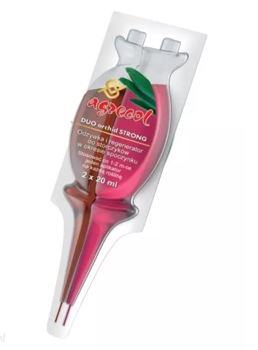 Kapalné hnojivo AGRECOL DUO ORCHID STRONG pro regeneraci orchidejí je skvělý pro všechny druhy orchidejí. Velkou výhodou tohoto kapalného hnojiva je jeho praktické balení. Díky balení ve speciální ampuli se bude hnojivo postupně uvolňovat ke kořenům orchideje a to 1 až 2 měsíce. Hnojivo se aplikuje tak že se špička ampule odštípne a vloží se do květináče s rostlinou. Z ampule se bude postupně uvolňovat hnojivo které podpoří regenerací orchideje po odkvetení. Hnojivo obsahuje dvě oddělené ampule ve kterých jsou účinné látky pro podporu zdravých zelených listů a k znovunasazení květů u odkvetlé orchideje. Hnojivo se aplikuje když orchidej již odkvétá a nebo je již zcela odkvetlá. Obsah: 30 ml.