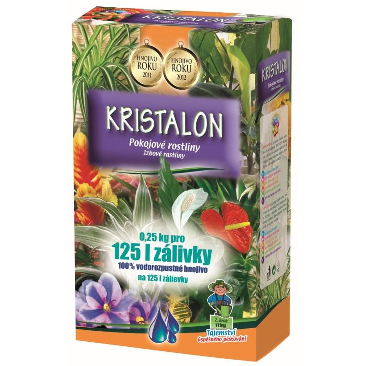 Kristalon pokojové rostliny je kvalitní hnojivo které je určeno pro všechny druhy pokojových rostlin. Hnojivo obsahuje vysoké množství živin a mikropvků které napomáhají vytváření nového kořenového systému a zajišťuje bohatý růst rostlin. Kvetoucím rostlinám napomáhá vytvářet nové poupata. Krystalické vodorozpustné NPK hnojivo 19% N + 6% P2O5 + 20% K2O + 3% MgO + mikroprvky. Balení Kristalonu obsahuje 500g hnojícího prášku které vystačí až na 500l zálivky. Součástí balení je také praktická odměrka zdarma. Kristalon je velice oblíbené a roky prověřené hnojivo.