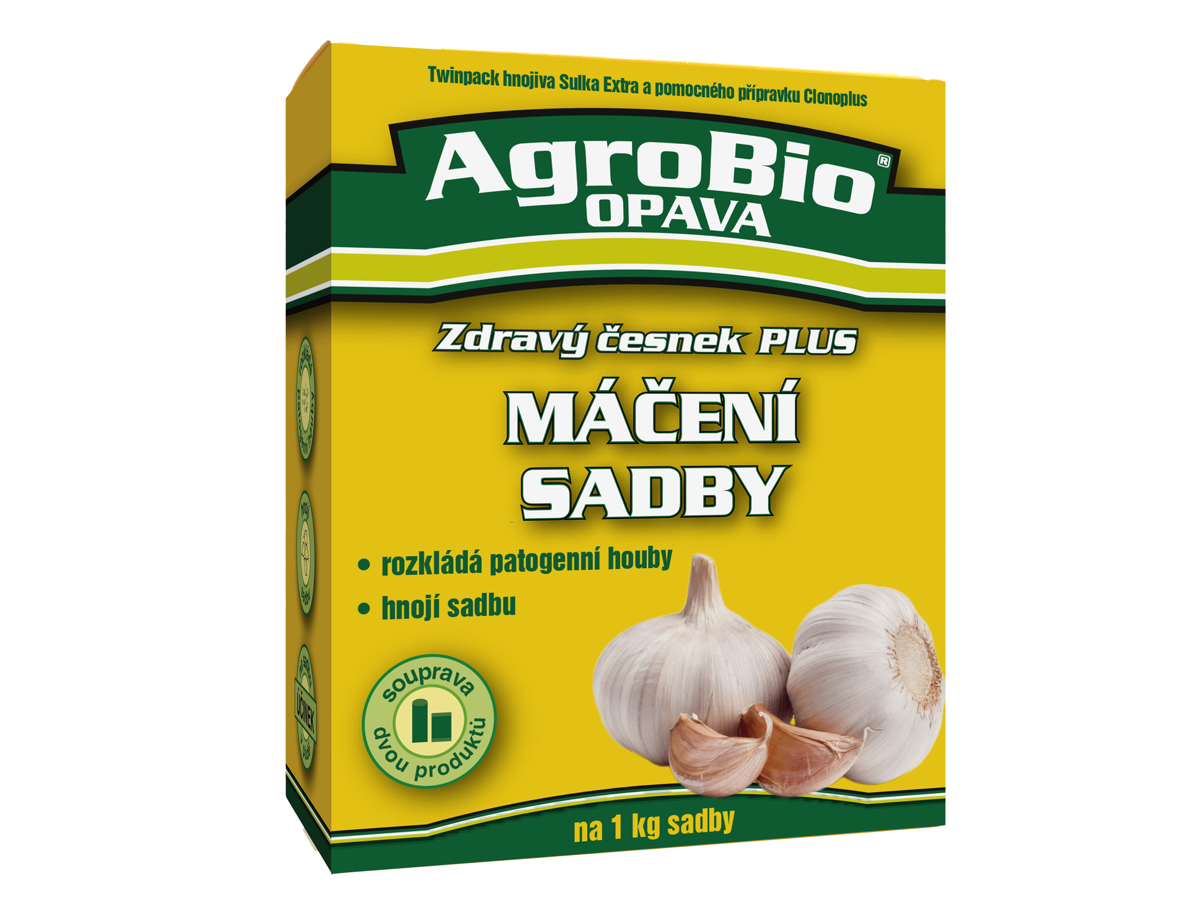 Máčení sadby - zdravý česnek Plus je souprava pomocného přípravku Clonoplus a hnojiva Sulka Extra. Tato souprava je určena k hnojení sadby máčením a poprachu stroužků česneku a je schopna rozkládat patogenní houby. Clonoplus je rostlinný přípravek v podobě prášku, který má schopnost rozkládat pro rostlinu organické zbytky v půdě a tím zvyšovat příjem živin z půdy a přes zimní období rozložit sklerocia, mikrosklerocia a chlamydospóry patogenních hub (Claviceps, Sclerotinia, Botrytis, Rhizoctonia, Verticillium).