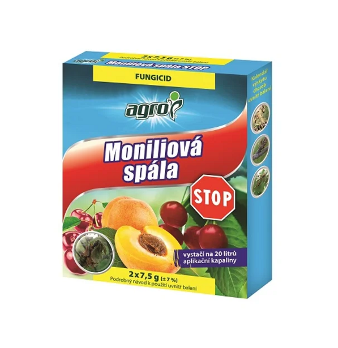 Přípravek Agro proti moniliová spála je vysoce účinný fungicid který se aplikuje postřikem. Slouží k ochraně proti moniliové spále meruněk a višní. Chrání rostlinu před napadením (prevence), ale také po infekci (kurativní účinek). Ochranná lhůta: 7 dní. Aplikace 2 x 7,5 g přípravku pro 20 l aplikační kapaliny tj. až na 7 středně vzrostlých stromů (=cca 3 l aplikační kapaliny/strom). Používejte přípravky na ochranu rostlin bezpečně a v souladu s instrukcemi. Před použitím si vždy přečtěte označení a informace o přípravku.