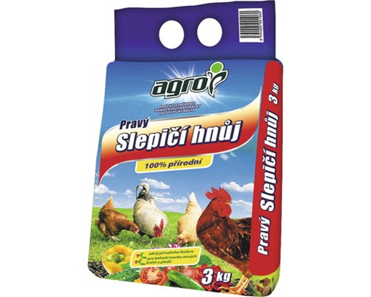 Hnojivo slepičí hnůj Agro je organické hnojivo které je zcela přírodní a proto se dá použít v ekologickém zemědělství. Slepičí hnůj je vyráběn procesem sušení a lisování. Hnojivo se dá použít pro všechny druhy ovoce, zeleniny a květin. Slepičí hnůj má přírodní původ takže je ideální pro hnojení především konzumních rostlin a plodů. Doporučené dávkování: 3 kg hnoje vystačí cca na 3 - 8 m2 dle typu rostlin.