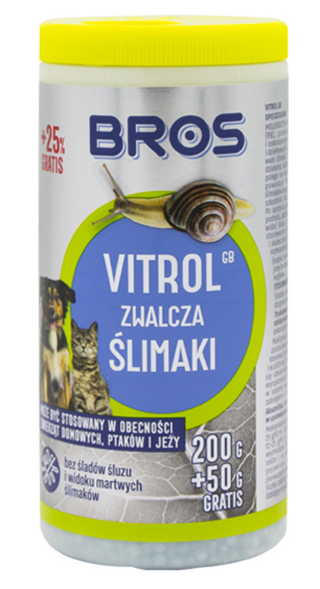 Světle zelené granule proti slimákům od firmy Bros jsou velice efektivní. Jeho složení je vyrobeno tak aby působilo na všechny druhy slimáků které se vyskytují v naších zahradách. Vitrol granule se aplikují okolo záhonu nebo tam kde chcete zabránit přístupu slimákům. Granule vlivem vlhkosti nabobtnají a jsou pak ještě atraktivnější, za sucha se granulím vrátí jejich původní velikost, účinnost se nesnižuje za deště nebo vlhkého počasí. Balení obsahuje 250g + 50g ZDARMA granulí které vystačí na plochu až 220 m². Granule proti slimákům VITROL neškodí a jsou bezpečné pro Vaše domácí mazlíčky, jako jsou kočky, psy atd. Jedná se o jeden z nejoblíbenějších přípravku proti slimákům na trhu. Účinná látka Vitrol GB. Výrobek je určen pro použití v ekologickém zemědělství.