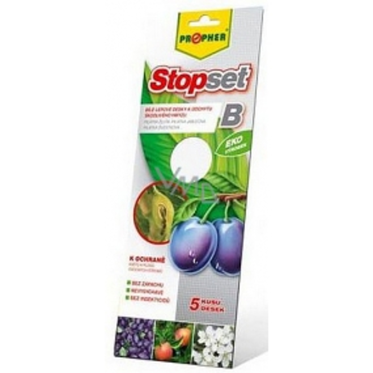 Lepové desky stopset B bílé slouží pro odchyt škodlivého hmyzu, jako jsou pilatka jablečná, pilatka švestková, pilatka žlutá, které škodí na jabloních, švestkách, meruňkách a broskvích. Především pilatka ŠVESTKOVÁ způsobuje značné škody na kvetoucích švestkách. Balení obsahuje 5ks lepivých desek o rozměru 10 x 25cm. Bílé lepové desky B vyvěste na místa výskytu škůdců v úrovni výšky rostlin. Životnost těchto desek je cca 6 týdnu. Po uplynutí 6 týdnu je potřeba desky vyměnit za nové. Jedná se o EKO výrobek.