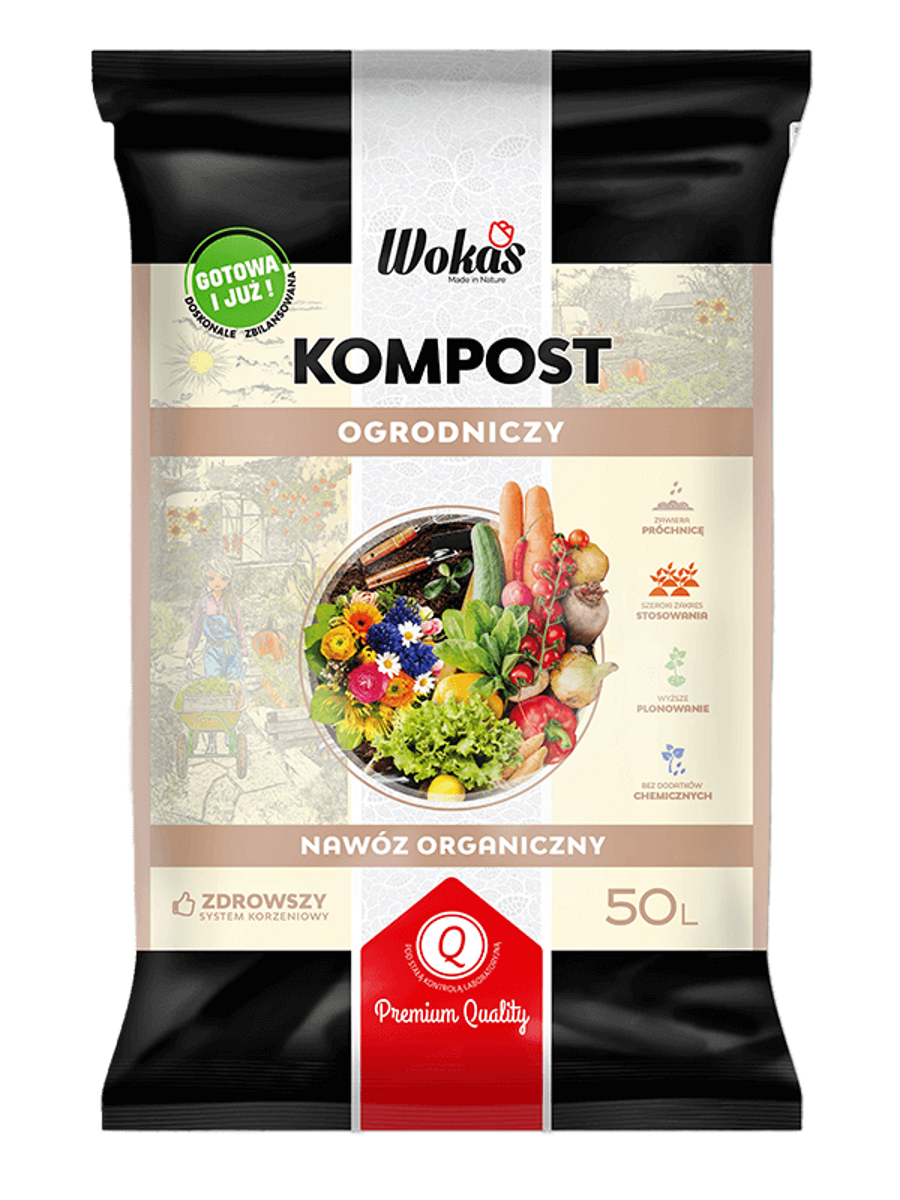 Wokas přírodní zahradnický kompost je 100% přirodní produkt. Výrobek je vyroben ze složek přírodního původu, rozložených samovolně, bez chemických přísad. Jedná se o organický produkt který se využívat do truhlíků, záhonů a také skleníků. Vysoký obsah živon zaručí všechny potřebné látky pro zdravý růst a kvetení rostlin. Činí půdu úrodnější a kypřejší. Kompost obsahuje přídavek dolomitického vápence. Balení obsahuje 50l kompostu.