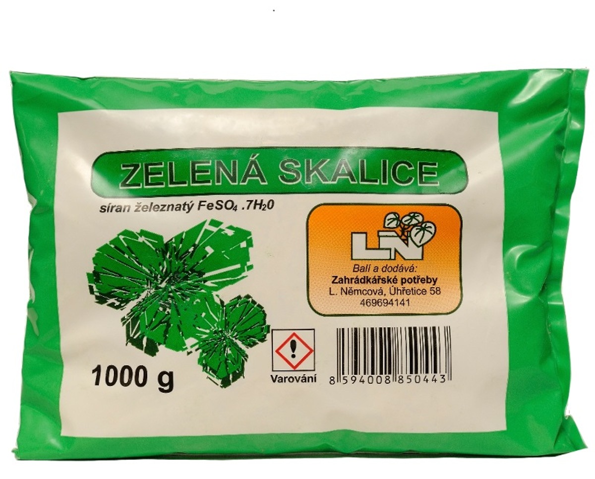 Zelená skalice - Síran železnatý se používá k hnojení roztokem na listy:trávníky, jádroviny, peckoviny, jahodník, réva vinná, konifer. Zelená skalice je rychle působící hnojivo určené pro doplnění železa ve výživě rostlin během vegetace. Podporuje rychlejší růst a zbarvení. Zelená skalice je vhodná při potížích na listech, a to především žloutnutí listů, tzv. chloroza (žloutenka). Hnojivo má kyselou reakci. Hnojení postřikem roztoku na list u okrasných rostlin,ovocných dřevin a révy vinné v červnu - 0,2 - 0,4% roztok, v červnu. Postřik aplikovat v podvečer nebo brzo ráno, nikdy ne za plného slunce. Balení obsahuje 1000g zelené skalice.